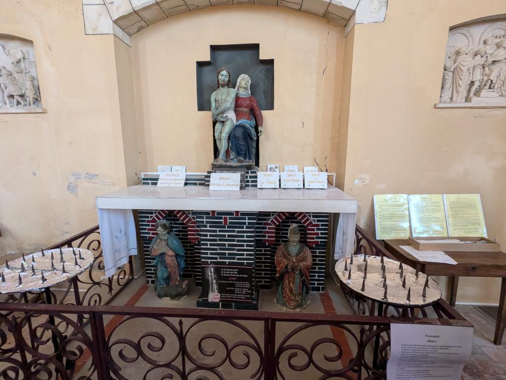 Par ailleurs l’abbé Renaud réalise aussi l'autel en briques vernies, sur lequel est placée la célèbre Piéta accompagnée en soubassement des deux autres statues de bois.