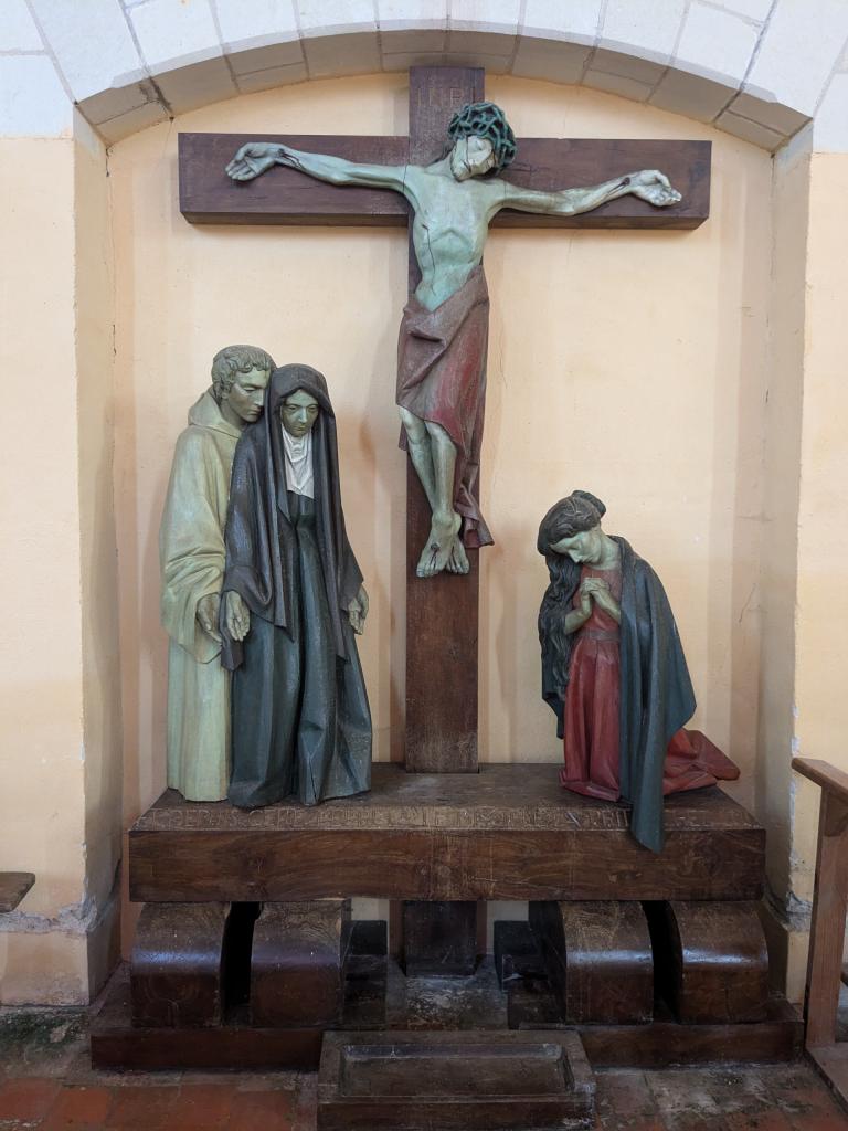 Ensemble en chêne polychrome posé sur les poutres d'un vieux pressoir local : le Christ, sa Mère et Jean, Ste Marie-Madeleine créé par Jean Fréour.
