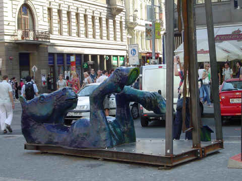 Sculpture équestre dans une rue. Le centre ville est plutôt réservé aux piétons