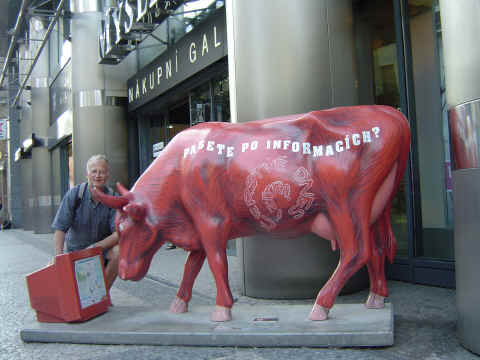 Une vache essaie de se familiariser avec les derniers concepts informatiques. Dans le cadre d'une exposition itinérante, des vaches à thème broutent dans toute la cité