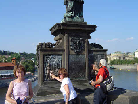 Des statues sur le pont Charles. Ici des passants lustrent des détails des sculptures porte-bonheur